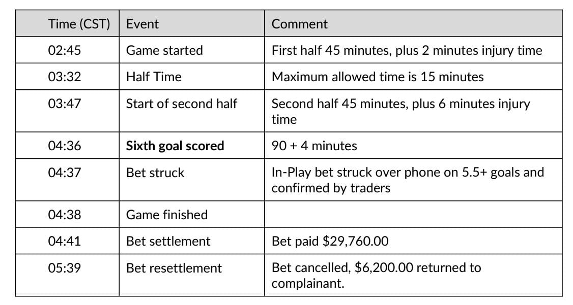 But a PointsBet audit trail tabled during the hearing revealed the punter had placed the bet at 4.37am (CST) – a minute after the sixth goal was scored in injury-time.