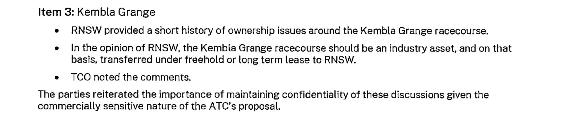 Racing NSW also expressed its desire at the meeting that Kembla Grange racecourse become “an industry asset”, with the freehold or long-term lease transferred to Racing NSW.